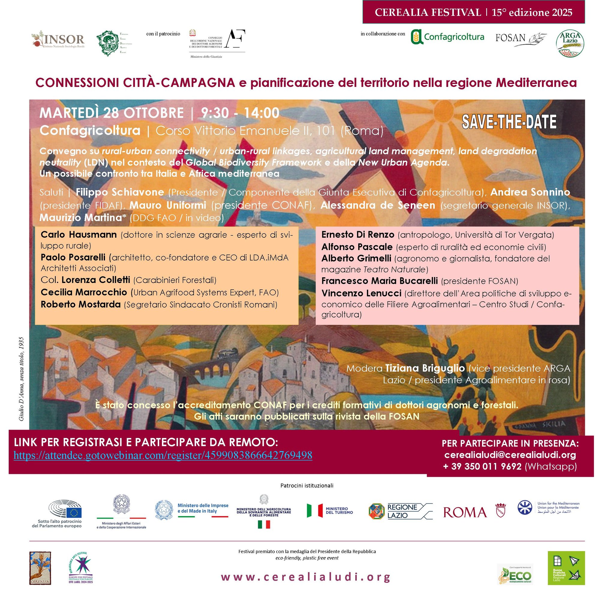 Diversi gli appuntamenti di approfondimento scientifico-culturale, tra cui il Convegno “Connessioni Città – Campagna e pianificazione del territorio nella regione Mediterranea” su rural-urban connectivity / urban-rural linkages, agricultural land management, land degradation neutrality (LDN) nel contesto del Global Biodiversity Framework e della New Urban Agenda. Un possibile confronto tra Italia e Africa mediterranea.