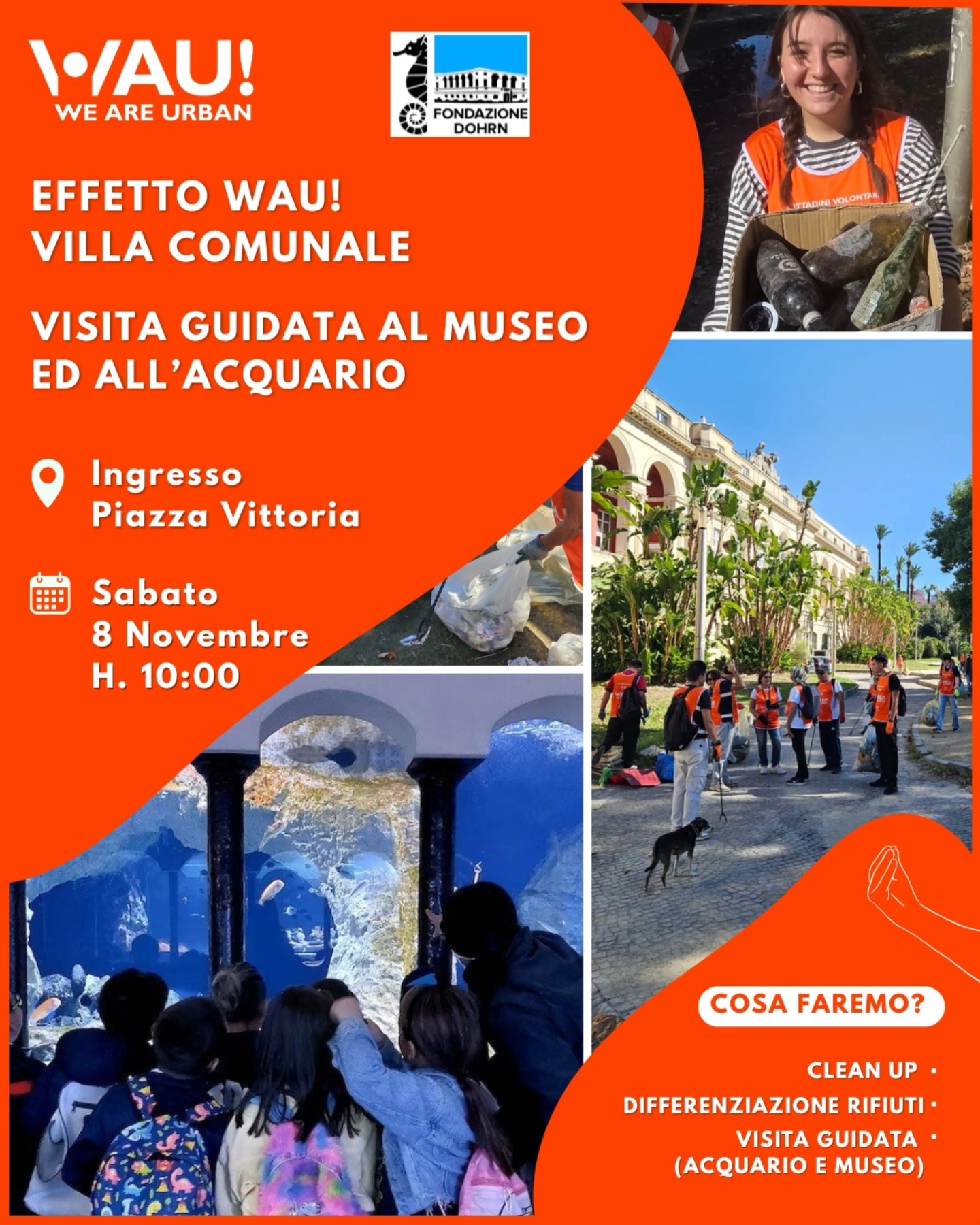Le persone di WAU! Napoli organizzano una seconda giornata di Clean Up per la Villa Comunale. Questa volta al clean up si unisce la scoperta del nostro mare, attraverso una vista guidata al museo ed all’acquario della Fondazione Dohrn.